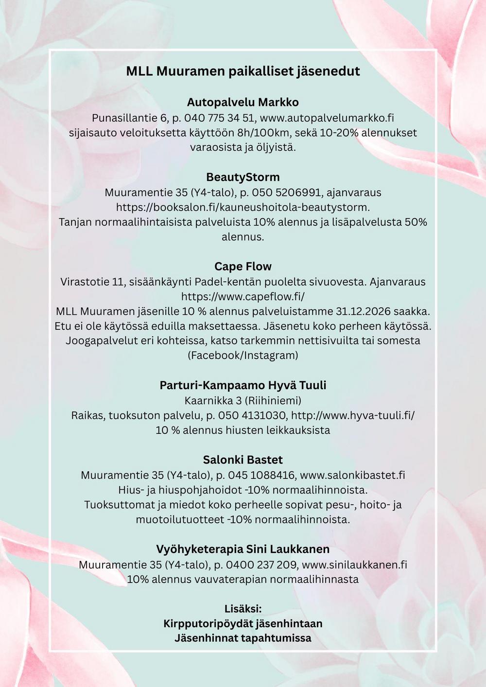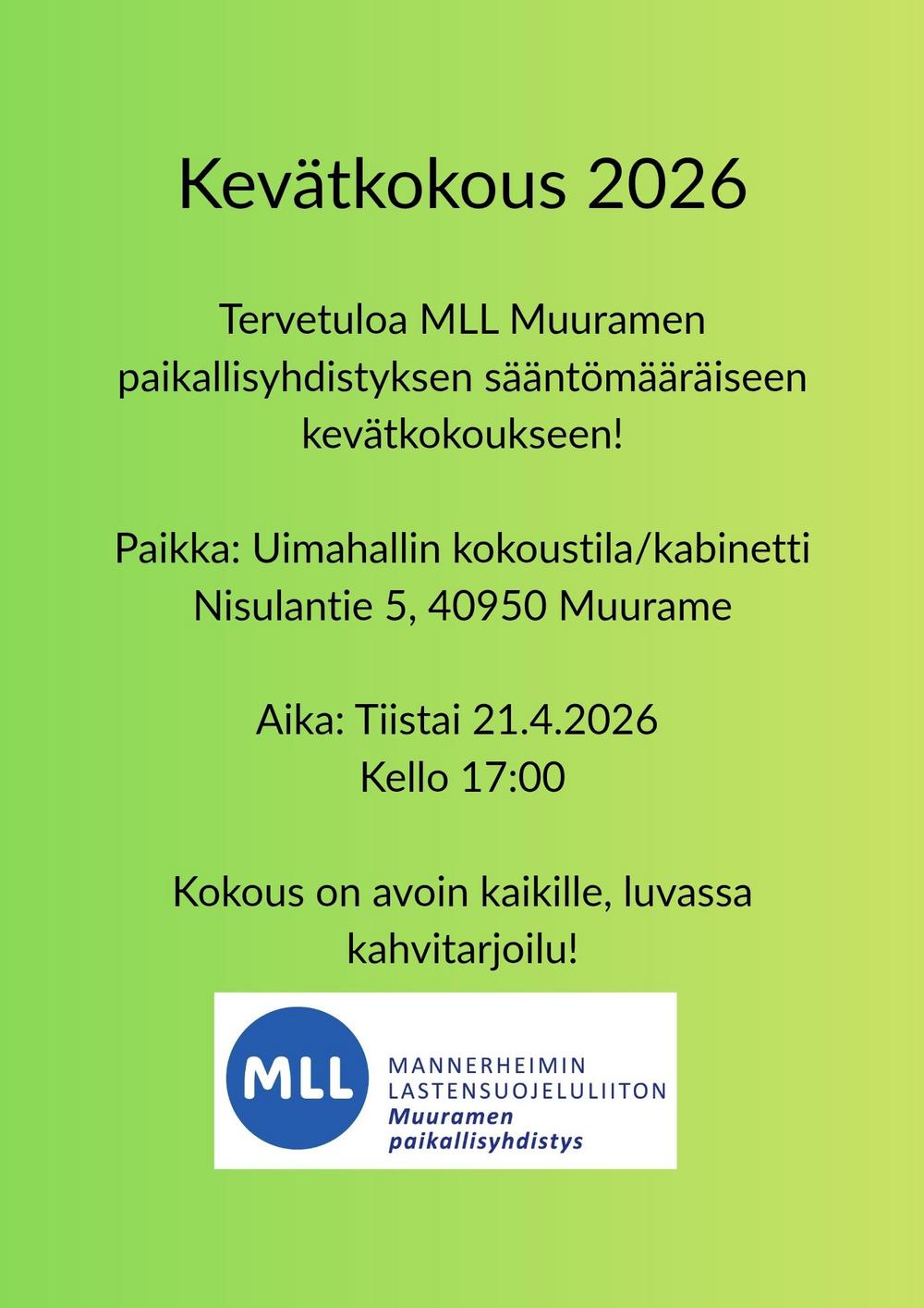 Tervetuloa sankoin joukoin MLL Muuramen sääntömääräiseen vuosikokoukseen keväisenä ja toivon mukaan aurinkoisena tiistaina 21.4.2026 klo 17:00. Paikkana uimahallin kokoustila osoitteessa Nisulantie 5,…
