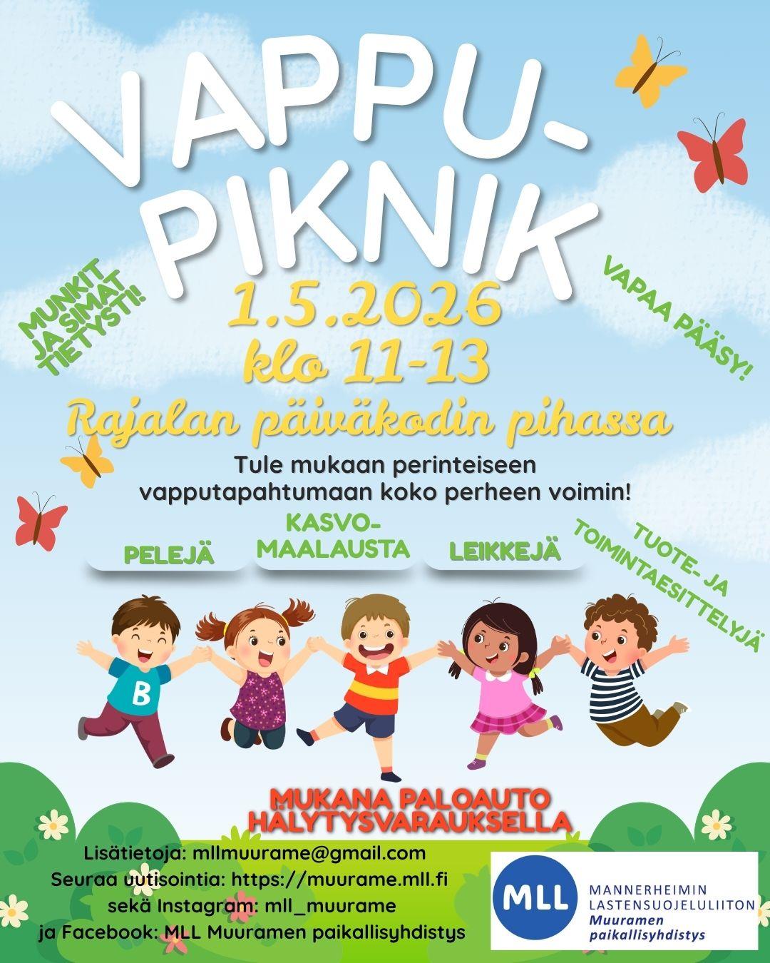 Perinteinen vappupiknik tänäkin vuonna Rajalan päiväkodin pihassa osoitteessa Mertamäentie 2, 40950 Muurame. Luvassa pelejä, leikkejä, tuote- ja palveluesittelyjä, paloauto (hälytysvarauksella) sekä…